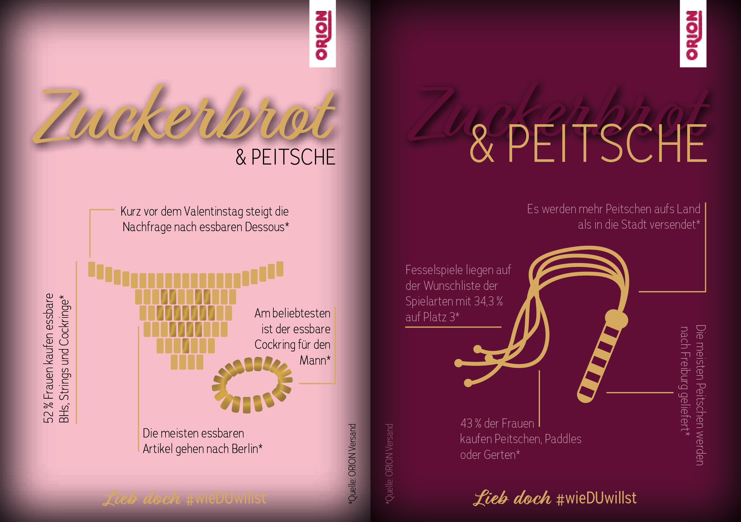 Angesichts des Filmstarts von „Fifty Shades of Grey 3“ verleihen in diesem Jahr vielleicht überdurchschnittlich viele Deutsche dem Valentinstag mit Peitsche, Augenmaske und Gerte neuen Schwung. „ORION vertreibt seit Jahren BDSM-Produkte und die Kenner dieser Spielarten werden sich von „Shades of Grey“ wohl auch kaum angesprochen fühlen. Vielmehr transportiert die Trilogie das Bondage-Thema in die breite Gesellschaft. Die steigende Nachfrage nach Produkten aus dem soften Bondage-Sektor zeigt uns vielmehr, dass der Film die Lust der Deutschen weckt, etwas mehr Pep und Abwechslung in ihr Liebesleben zu bringen“, so Susanne Gahr, Pressesprecherin beim ORION Versand. Eine aktuelle ORION-Umfrage mit mehr als 14.000 Teilnehmern hat ergeben, dass Fesselspiele auf der Wunschliste der sexuellen Spielarten der Deutschen mit 34,3 Prozent auf Platz 3 liegen. Die meisten Peitschen verschickt der ORION Versand übrigens nach Freiburg.