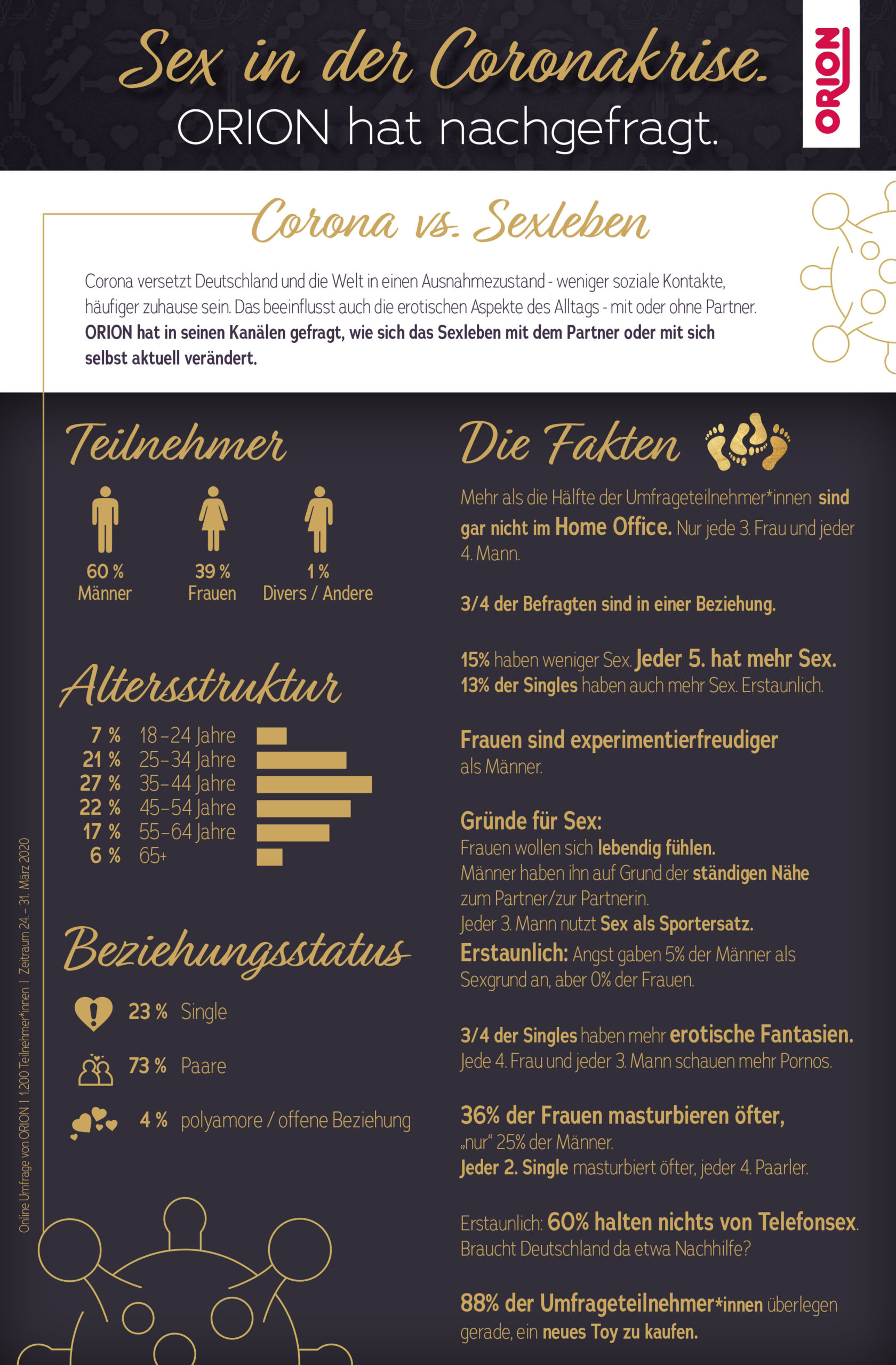 Die Corona-Pandemie versetzt Deutschland und die Welt in einen Ausnahmezustand – wir haben weniger soziale Kontakte, sind dafür viel häufiger zuhause. Das beeinflusst auch die erotischen Aspekte des Alltags – mit oder ohne Partner. ORION wollte es genau wissen und hat in seinen Kanälen gefragt, wie sich das Sexleben mit dem Partner oder sich selbst verändert. 1200 Teilnehmer standen uns Rede und Antwort – 60 Prozent von ihnen männlich, 39 Prozent weiblich, 1 Prozent Divers/ohne Angabe.